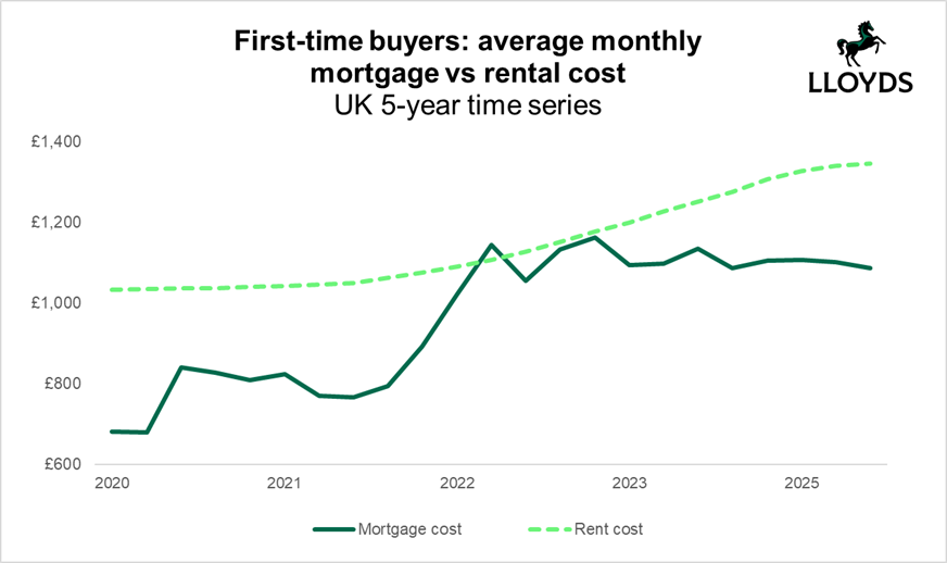 Typical monthly mortgage costs have risen by just 0.1% for first-time buyers over the last year to £1,087. This is a result of lower interest rates offsetting the modest increase in property prices.
