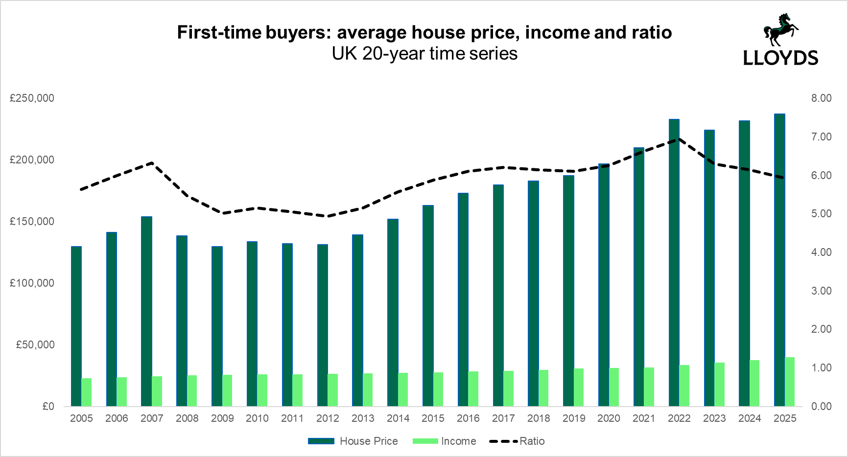 According to UK Finance, the average household income for a first-time buyer mortgage application last year stood at just over £65,000* which puts the equivalent property price to household income ratio at around 3.7, and the mortgage cost as a percentage of joint income at closer to 20%.