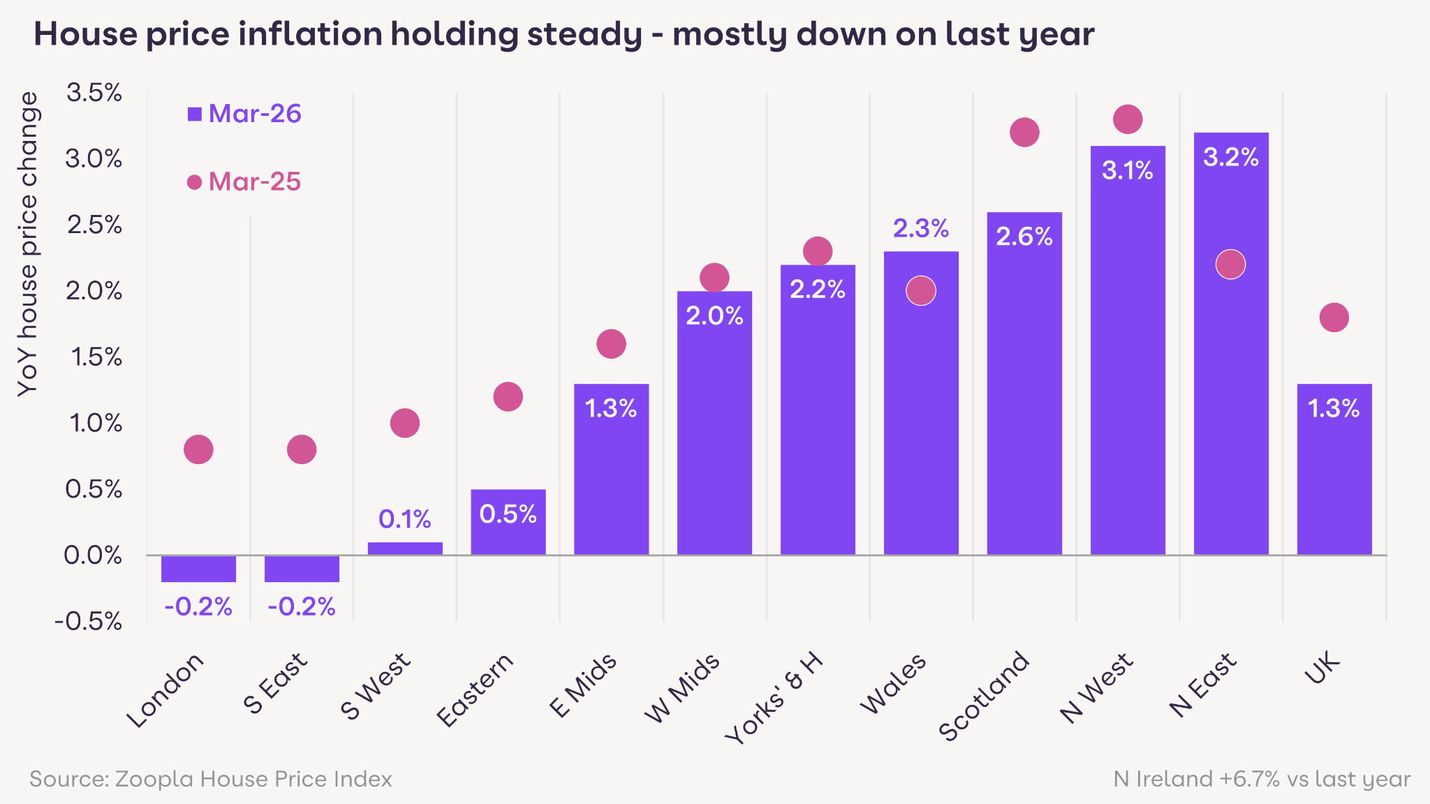 The report finds that sales agreed are just 3% down on last year with a clear rebound in buyer enquiries after the Easter break, with those looking to move encouraged by a ceasefire and mortgage rates starting to drift lower. Zoopla’s house price index shows UK house price inflation is holding steady at 1.3%, compared to 1.8% a year ago with the average price of a UK home sitting at £271,700.